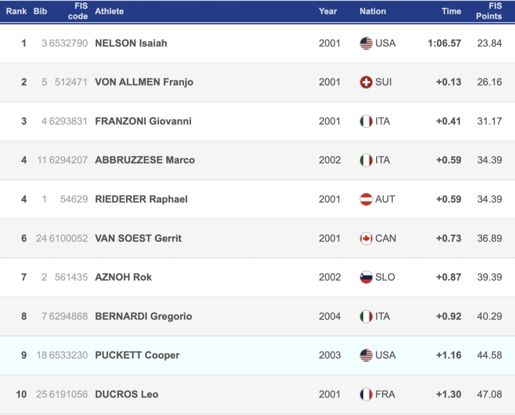 Behind Nelson was 20-year-old Franjo Von Allmen of Switzerland who grabbed his second silver of the series, 0.13 seconds behind Nelson. This marks two second-place finishes for the first time Junior World participant after his second-place finish in the downhill.