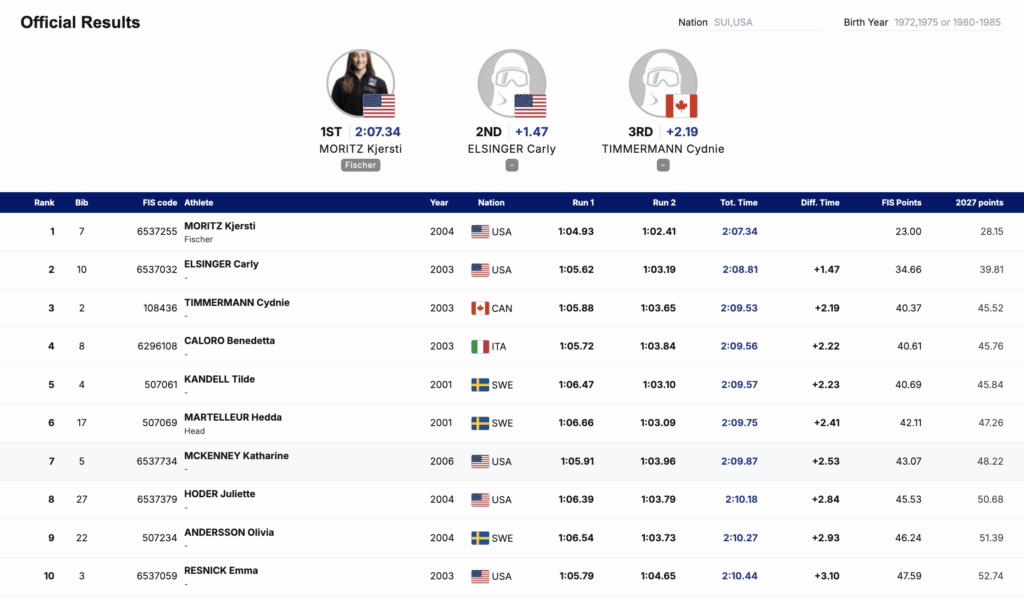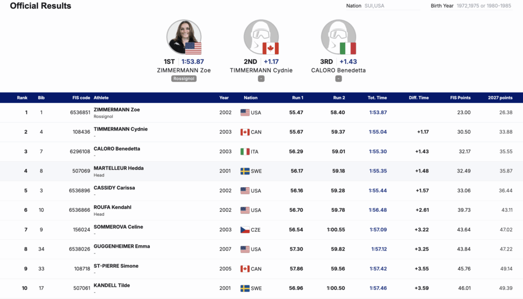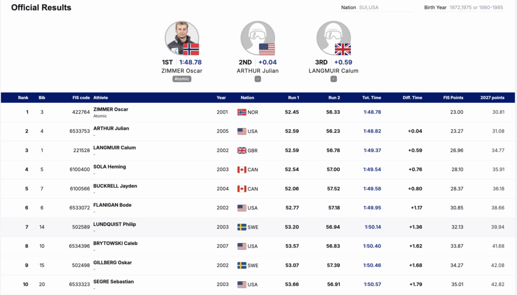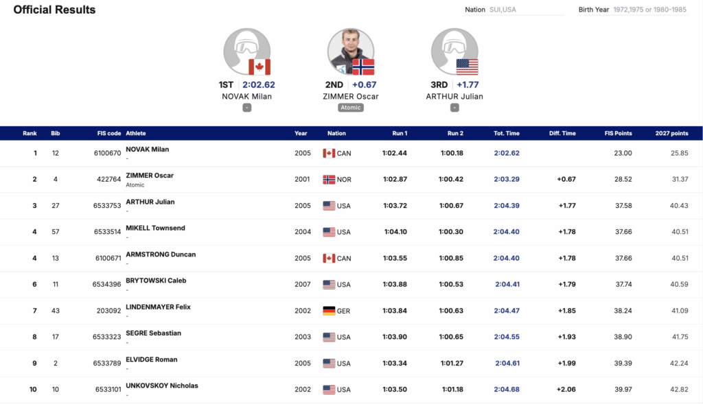 Arthur said of his results, “It was a great weekend. The conditions were excellent, and the weather was perfect. I really enjoyed the hill and what I was feeling skiing it.” He commended his teammate Milan Novak for his victory in the GS and the entire team for “showing depth and a big improvement compared to previous weeks.”