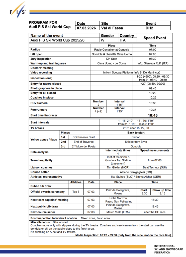 The FIS Alpine Ski World Cup women remain in Val di Fassa, Italy, where the La VolatA course hosts Downhill 2 of the weekend and the eighth downhill race of the 2025–26 season.