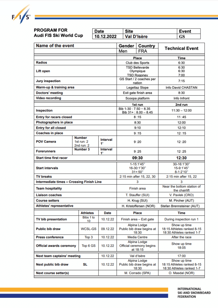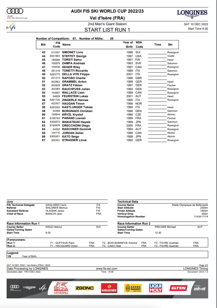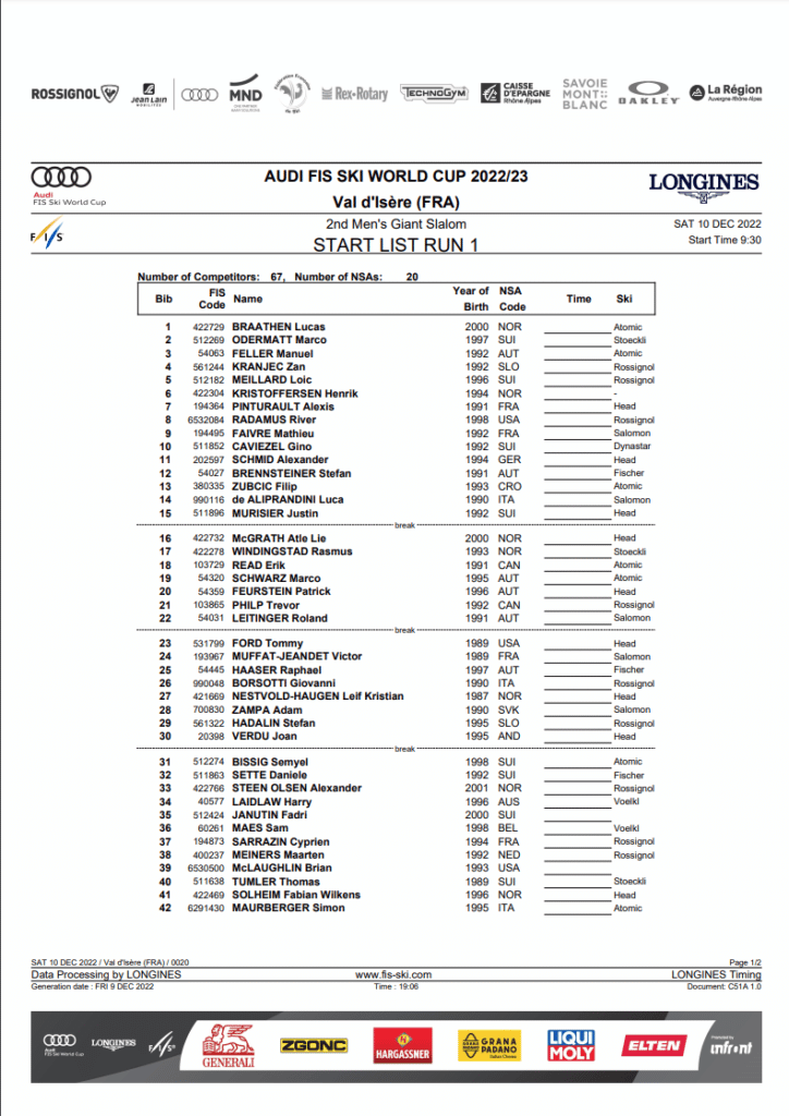 The first run for the men’s GS starts at 3:30 am Eastern Time and 12:30 am on the West Coast. Additionally, the second run will begin at 6:30 am Eastern Time and 3:30 am on the West Coast. To remind you, a full replay is available after the race on Ski and Snowboard Live.