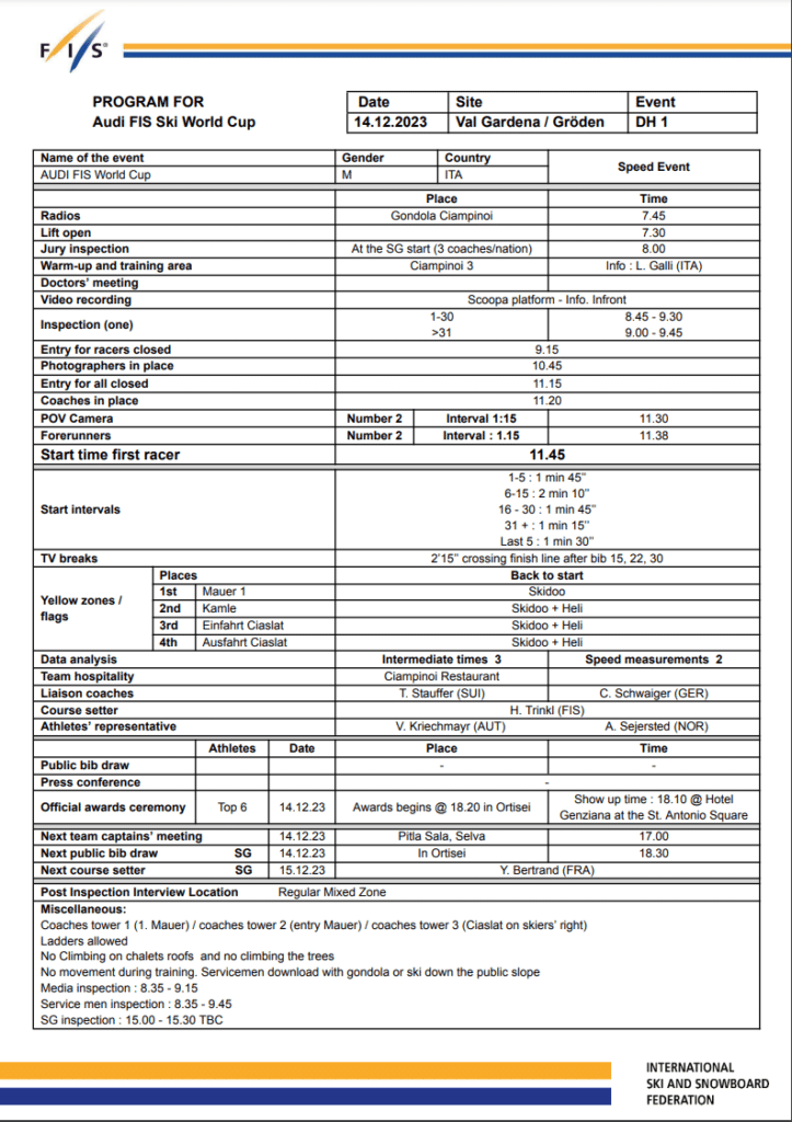 Program for the Thursday’s, December 14th Zermatt-Cervinia replacement downhill in Val Gardena/Gröden