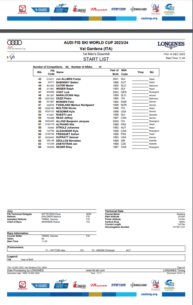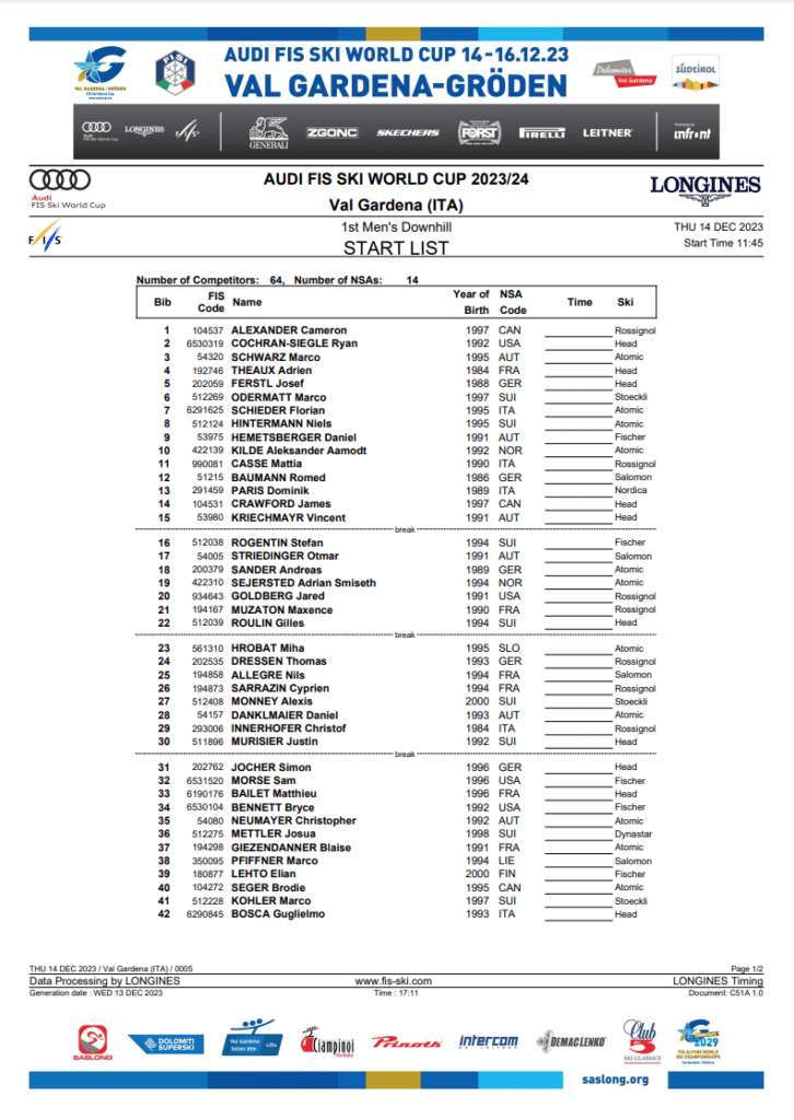 Start list and race program for Thursday’s, December 14th, Zermatt-Cervinia replacement downhill in Val Gardena/Gröden