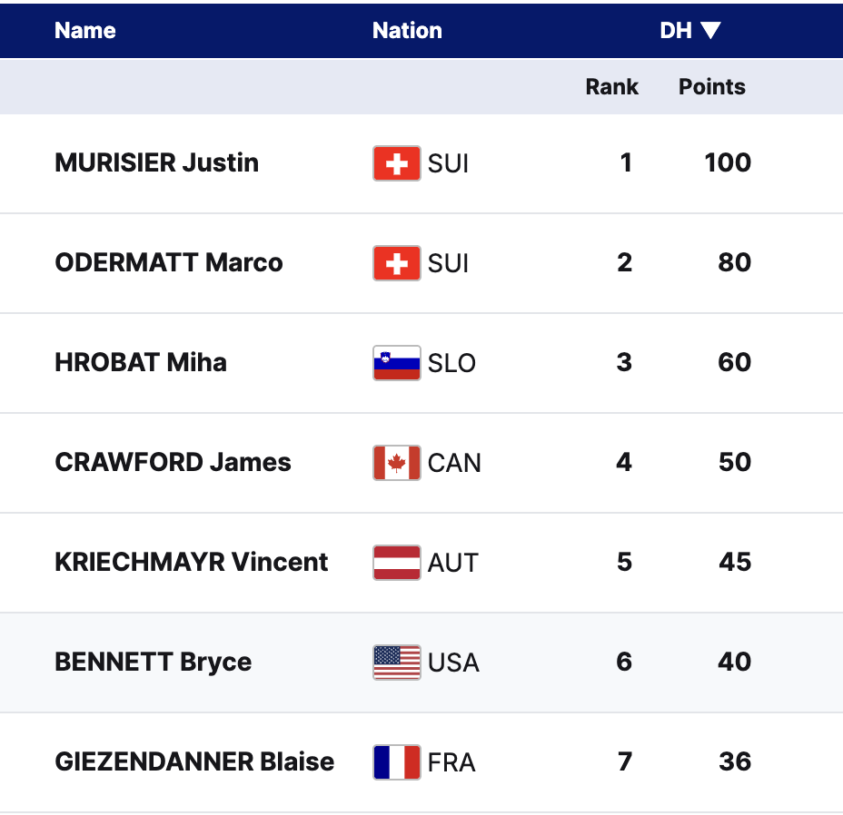 Murisier’s breakthrough win set an exciting tone for the season, while Odermatt’s consistency reaffirmed his place at the top. Hrobat’s milestone result further highlighted the increasing competitiveness in men’s downhill racing. Switzerland showcased their depth with five racers finishing in the top 15.