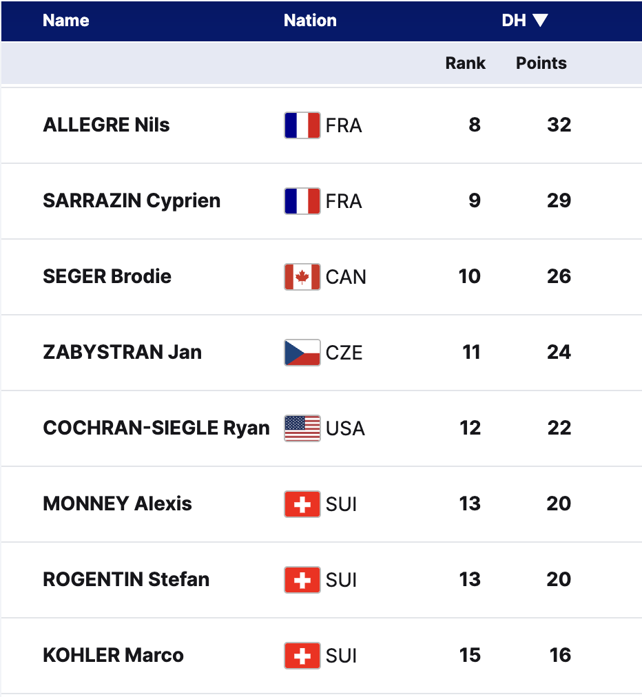 Current 2024-25 Men’s World Cup Top 15 Downhill Rankings