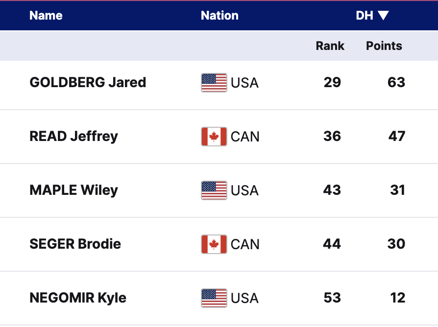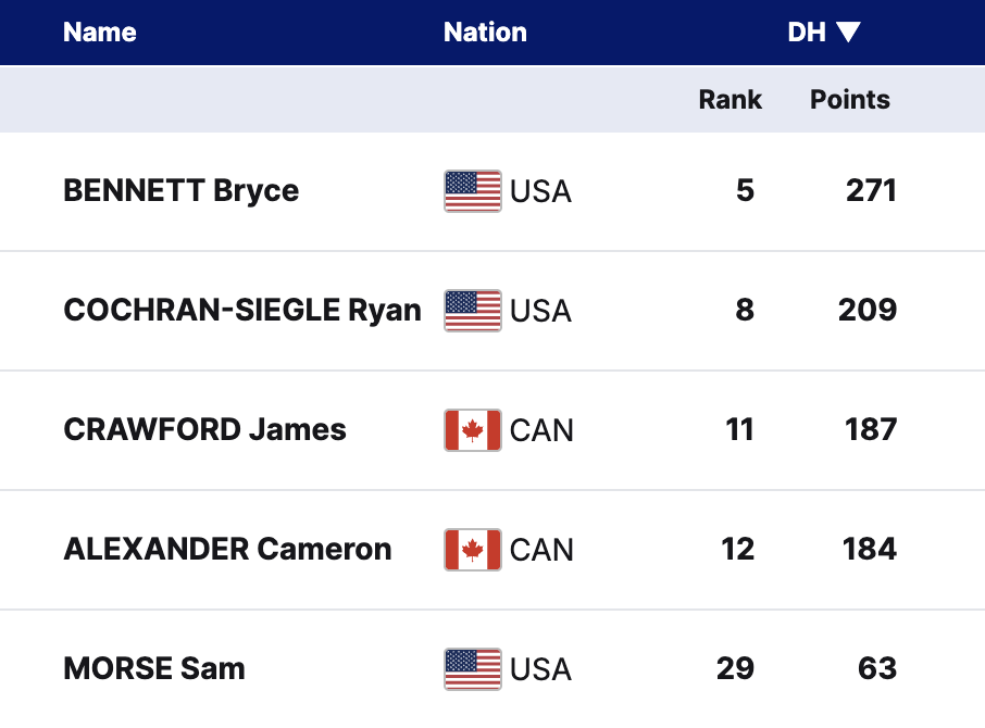 North Americans on the DH World Cup Start List (WCSL)