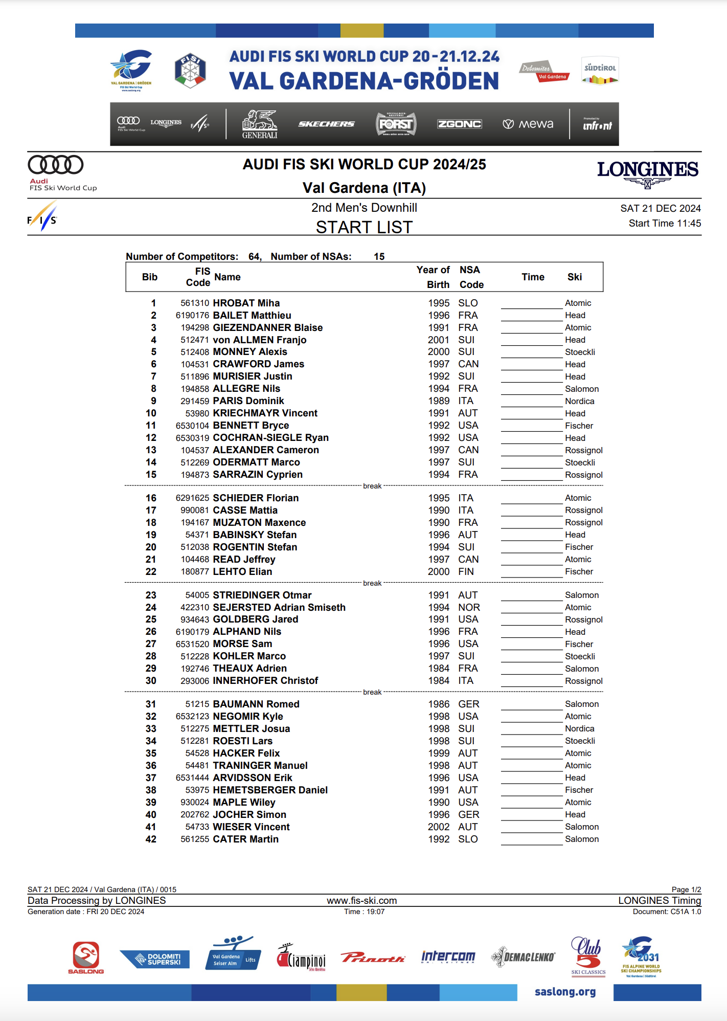 Val Gardena has long been a stronghold for North American speed skiers. Last season, seven of the ten North Americans on the Downhill World Cup Start List scored points on the Saslong. Bennett (USA), James “Jack” Crawford (CAN), Jared Goldberg (USA), Cameron Alexander (CAN), Ryan Cochran-Siegle (USA), Jeffrey Read (CAN) and Kyle Negomir (USA) all delivered strong performances, showcasing the track’s compatibility with their skills.