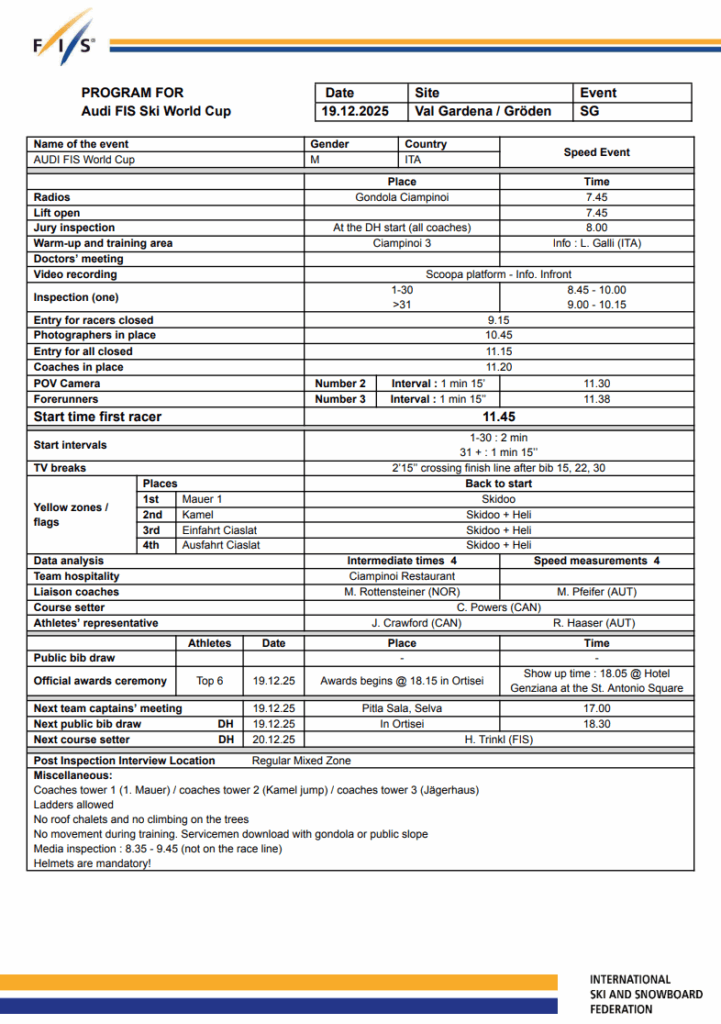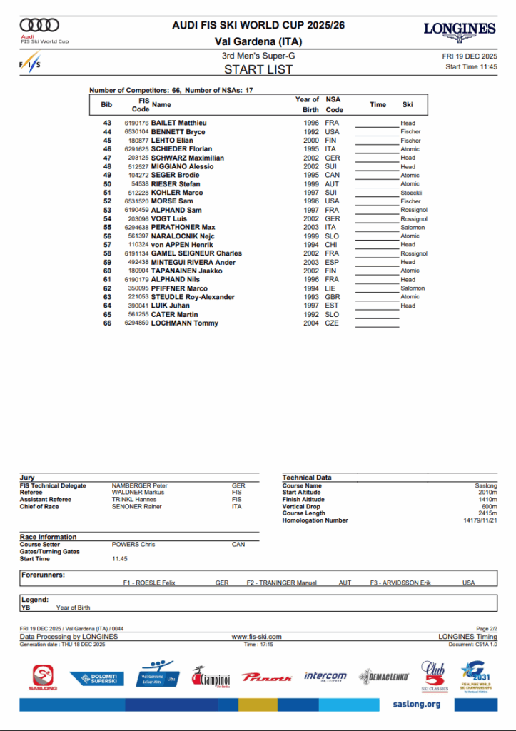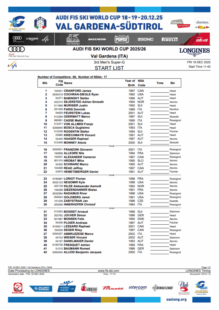 Val Gardena / Gröden Men’s Super-G Start List