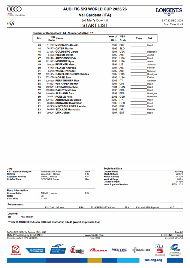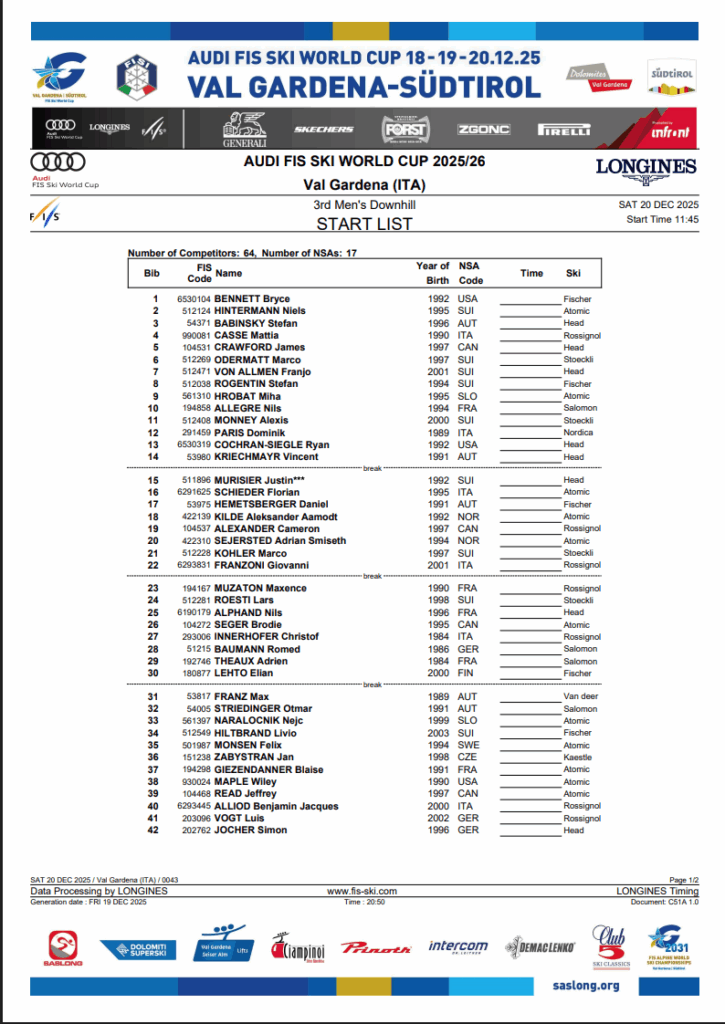 Bryce Bennett (bib 1) returns to his best venue, having won twice on the Saslong, while Ryan Cochran-Siegle (bib 13) brings both momentum and course history after finishing third here last season behind Marco Odermatt and Franjo von Allmen, and opening the season second in Beaver Creek. Sam Morse (bib 53) also carries a history of excellence on the Saslong, a course that rewards confidence, glide, and fearless commitment.