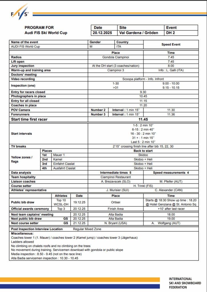 Saturday’s Saslong classic downhill closes the third and final day of racing this season in Val Gardena / Gröden. The men return to the full-length course for one of the most iconic races on the World Cup calendar. Set high in the Dolomites and backed by passionate Italian fans, the Saslong demands full commitment from the start. The Ciaslat’s rolling, demanding terrain exposes hesitation, while those who stay balanced and carry speed are rewarded all the way to the finish.