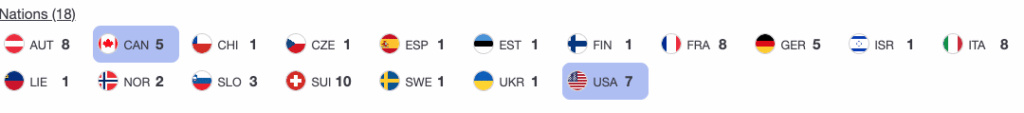 Alpine Canada Alpin brings a compact but experienced group to the Saslong. James Crawford (bib 5) and Cameron Alexander (bib 19) anchor the lineup on a course that rewards aggressive skiing and confidence at speed. Brodie Seger (bib 26) and Jeffrey Read (bib 39) add depth and experience across changing terrain.
