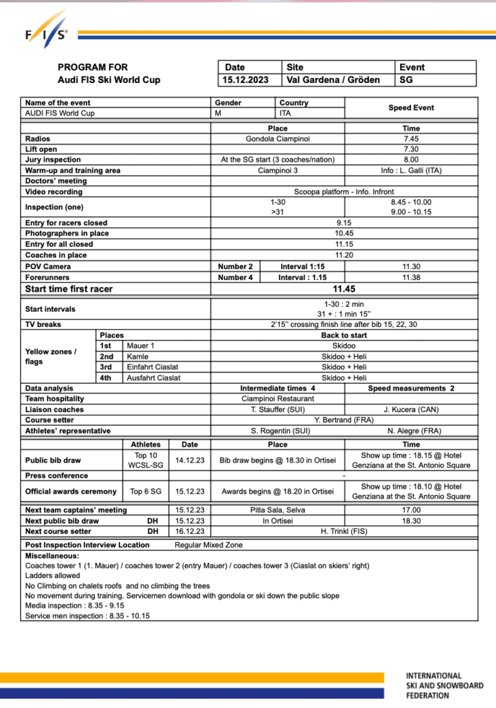 Program for the December 15th Val Gardena/Gröden men’s World Cup super-G