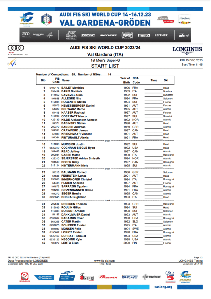 Start list and race program for Friday’s, December 15th, Val Gardena/Gröden men’s World Cup super-G