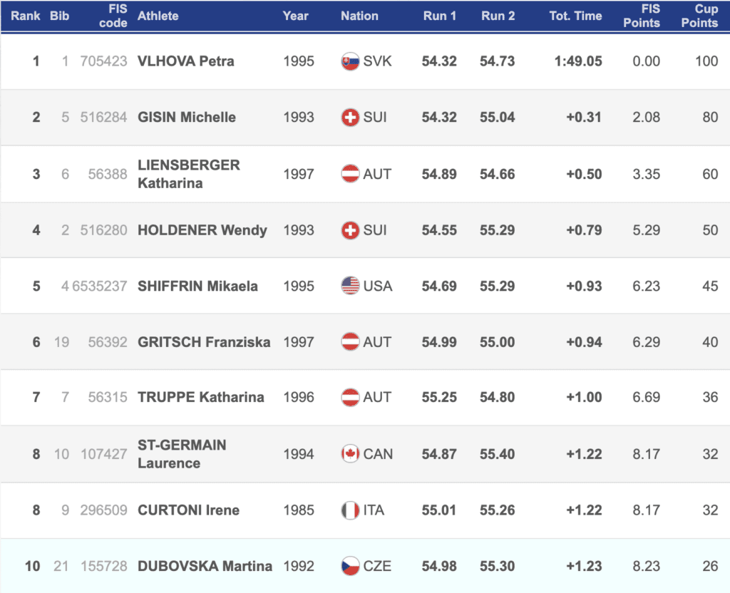 Following her back-to-back wins, Vlhova went top of the overall standings with 260 points, well ahead of Gisin with 175 and Shiffrin with 125.