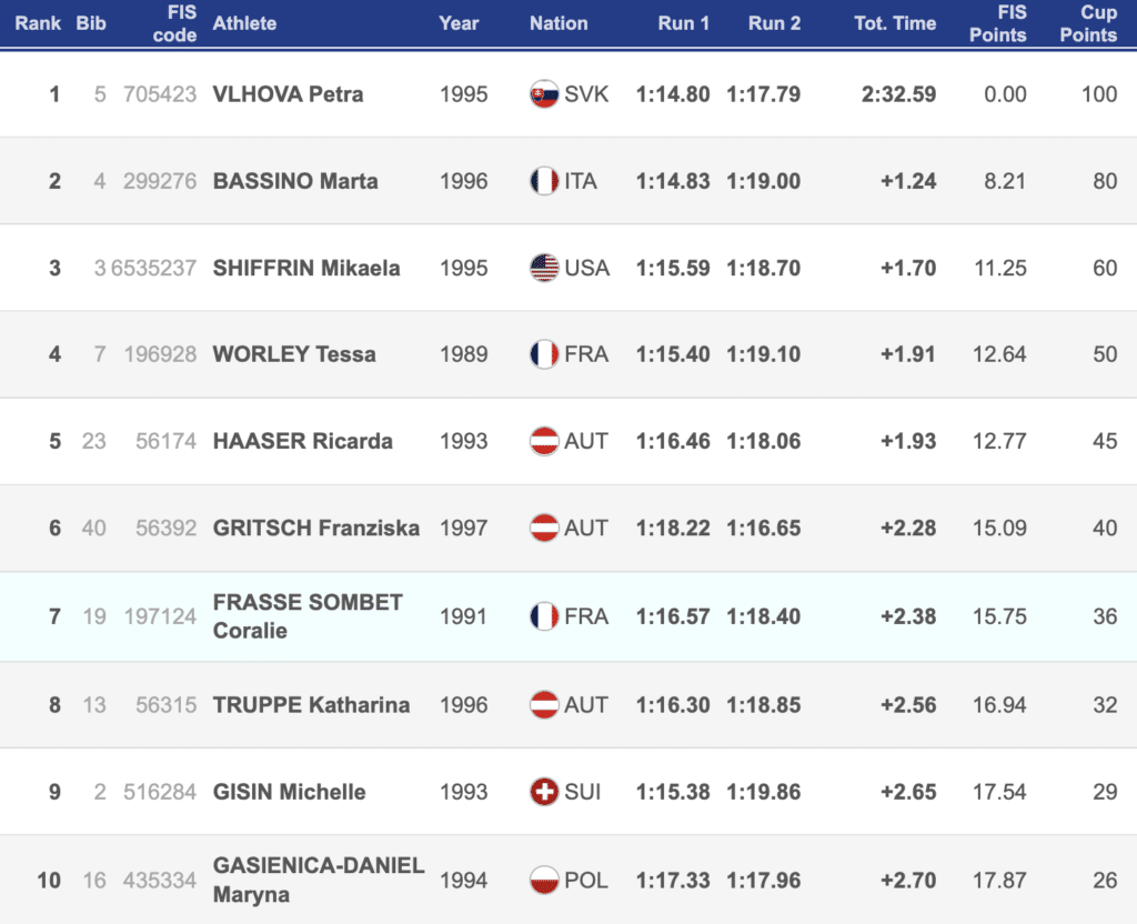Hector had her lead in the discipline standings cut to just five points from Tessa Worley, who finished fourth. Hector was on the podium in each of the last six giant slaloms while winning three of them.