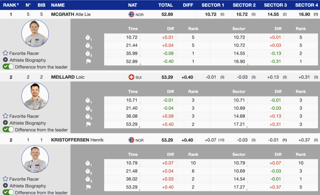 Running first, Henrik Kristoffersen set the early benchmark at 53.29. Bib two Loïc Meillard matched the Norwegian exactly, tying Kristoffersen at +0.40 and showing both men arrived prepared to contend.