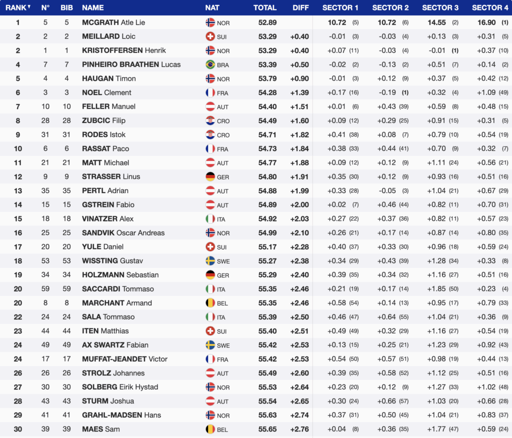 Atle Lie McGrath delivered an aggressive run skiing the challenging terrain to lead Sunday’s men’s World Cup slalom in Wengen, stopping the clock in 52.89. The Norwegian, also last season’s Wengen slalom winner, built momentum through the middle of the course and separated himself decisively in the final sector, where his power and timing stood out on one of the tour’s most punishing slopes.
