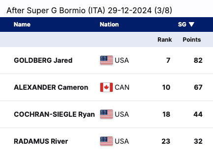 The North American contingent features a strong lineup for Friday’s Wengen Super-G. Jared Goldberg leads the charge for the Stifel U.S. Ski Team, currently ranked seventh in the season super-G standings. Goldberg experienced a career-best second-place finish in Val Gardena, earning his first World Cup podium.