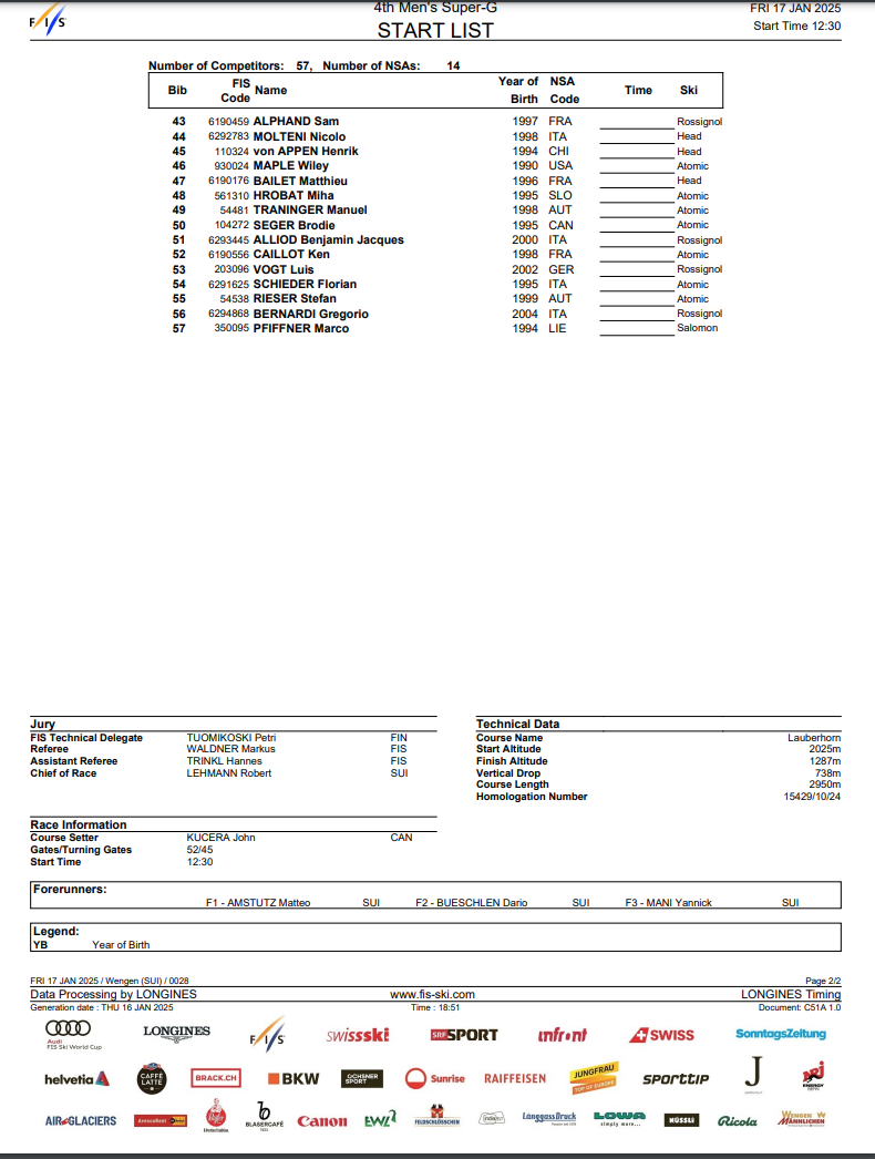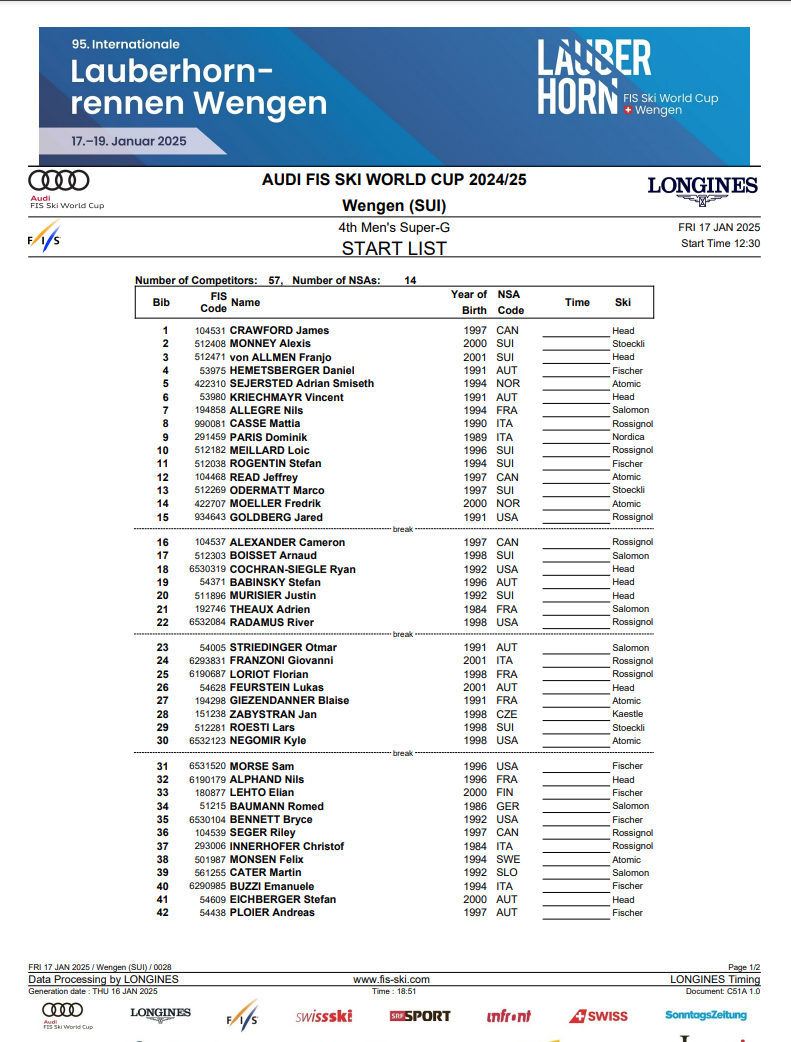 Fifty-seven athletes from 14 countries will compete in the Wengen Lauberhorn super-G on Friday, Jan. 27th. The course setter is John Kucera (CAN).