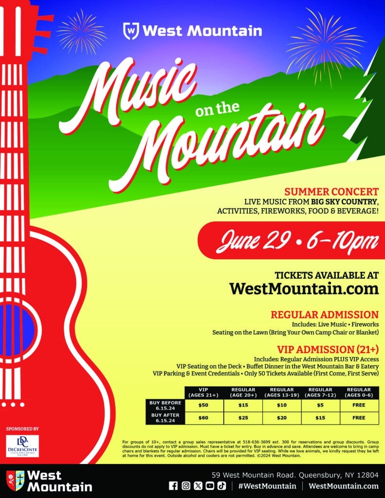 West Mountain kicks off the 2024 summer season on Saturday, June 29 with its annual Music on the Mountain event from 6-10pm featuring live music from headliner Big Sky Country and opener Bravely Music, food and beverage, activities, and fireworks!