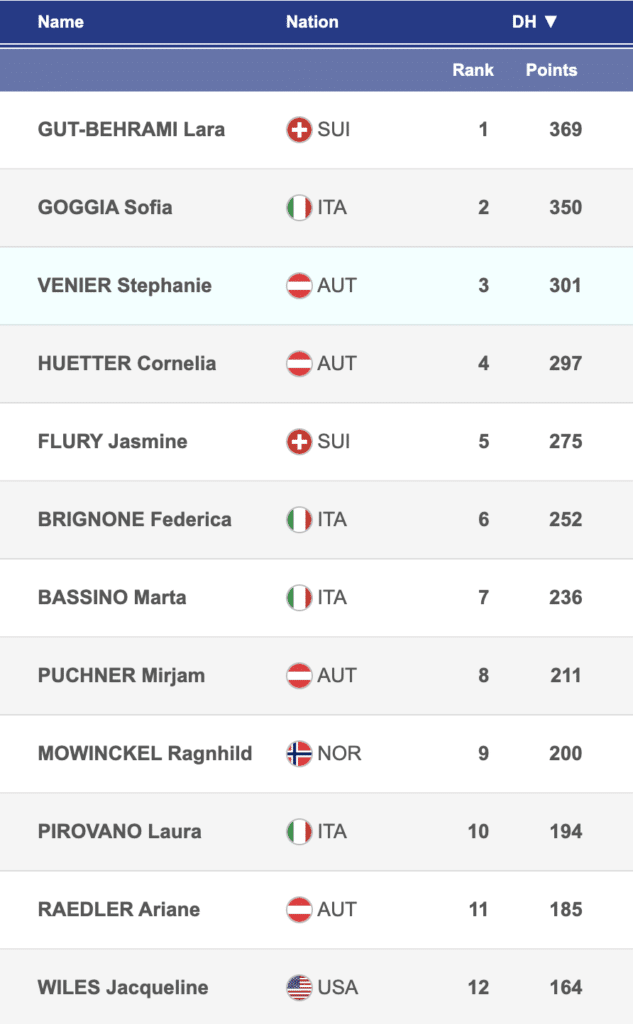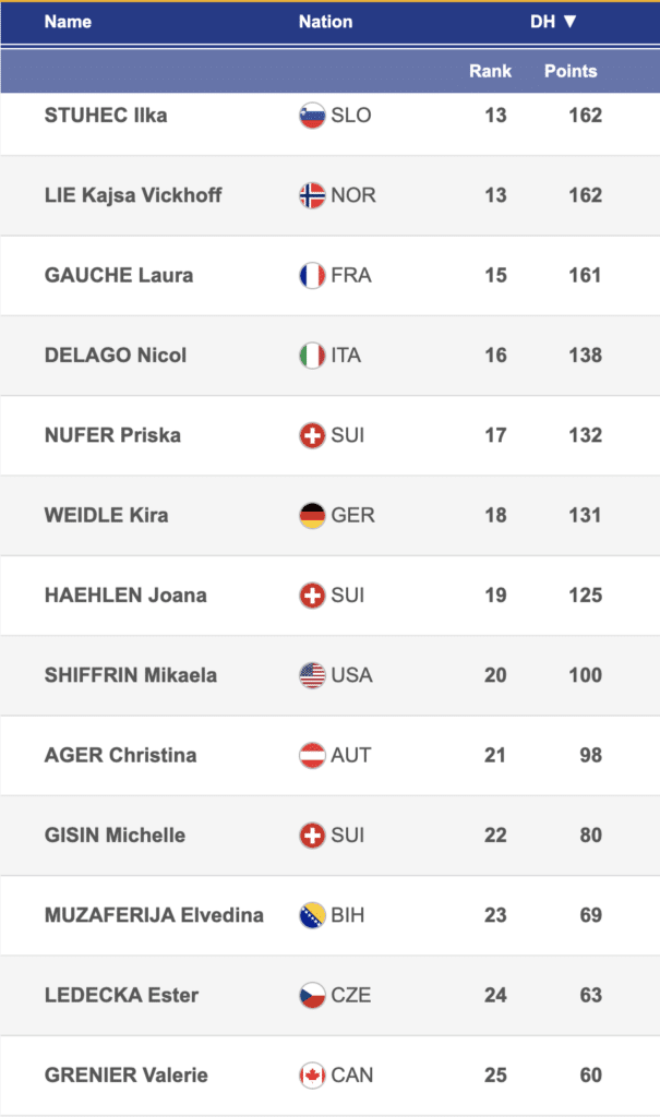 2024 women’s Nations Cup downhill standings