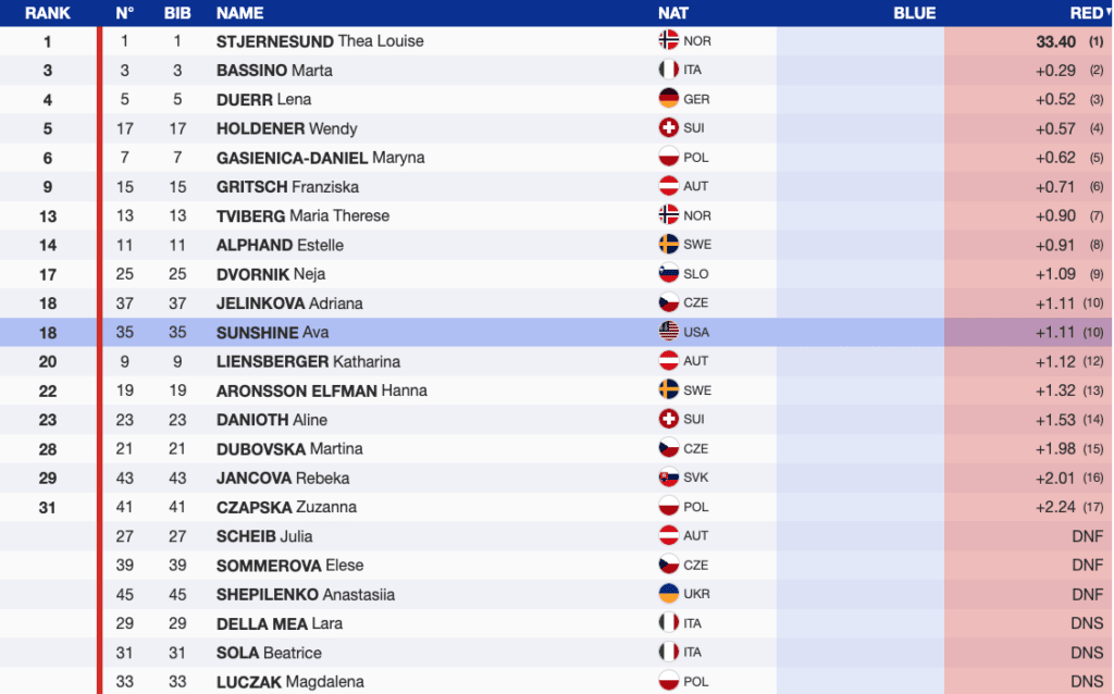 Sweden’s Sara Hector was one of two top ten World Cup GS skiers who did compete in the qualifier, so it was no surprise she was fastest on her blue course. Norwegian Thea Louise Stjernesund unexpectedly was the fastest of the qualifiers on the red. However, it is no surprise that second in the red course is Italy’s super-G World Champion Marta Bassino, who is currently third in the World Cup GS standings.