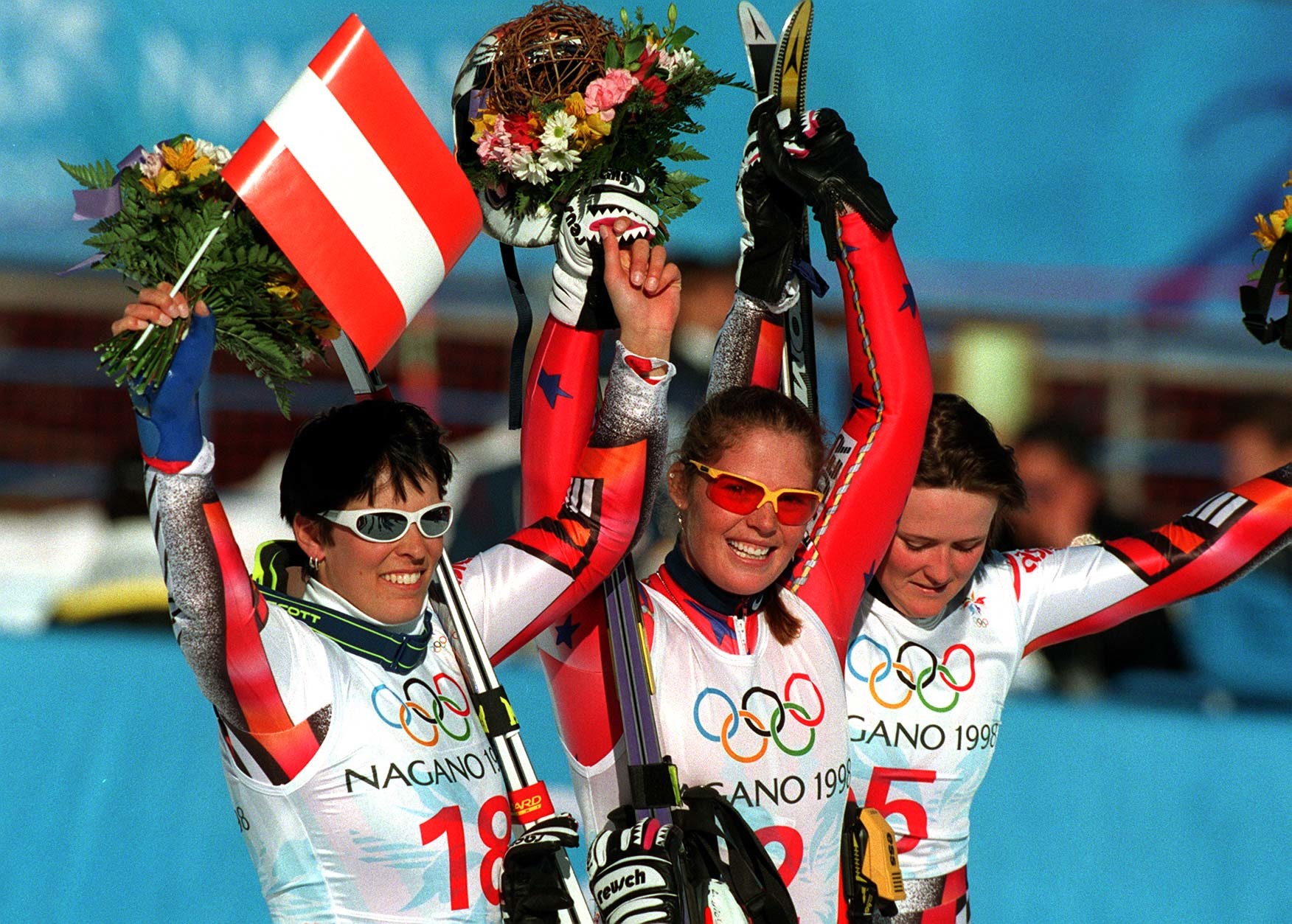 Dorfmeister AUT, Street USA, Meissnitzer AUT / Nagano Olympic SG podium/ GEPA pictures