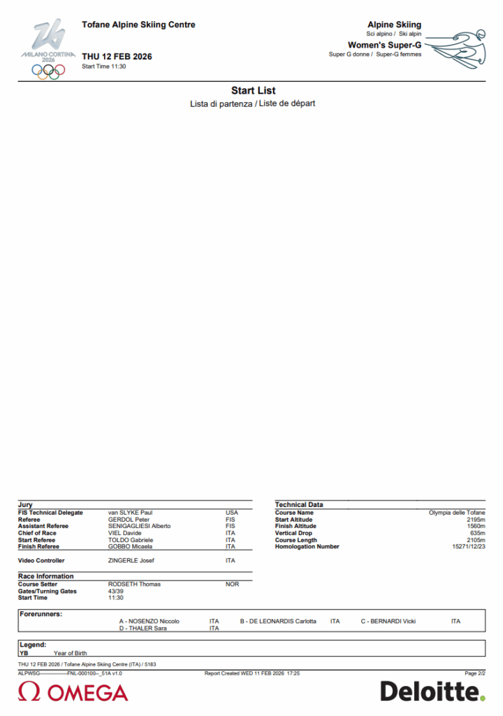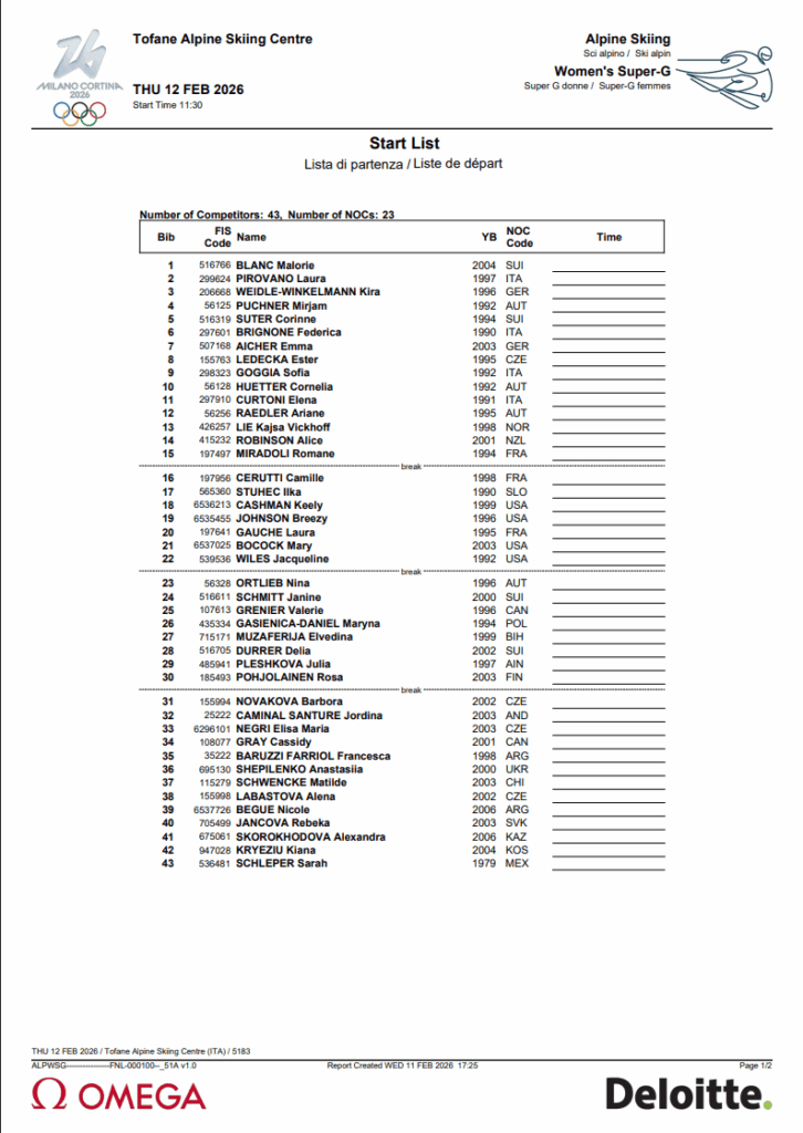 The start list is out for the Women’s Olympic Super-G at Olympia delle Tofane.