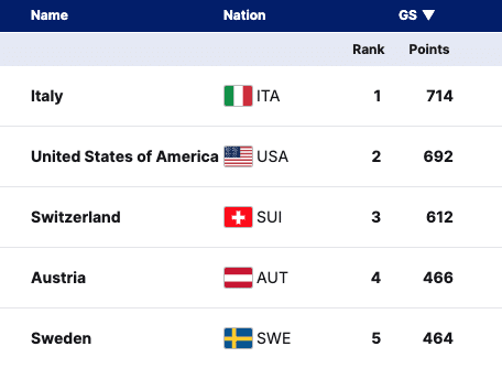 Italy leads the Women’s Giant Slalom Nations Cup with 714 points, but the race remains tight. The United States sits just 22 points behind with 692, keeping the battle for the top spot wide open.