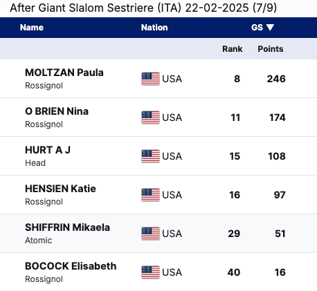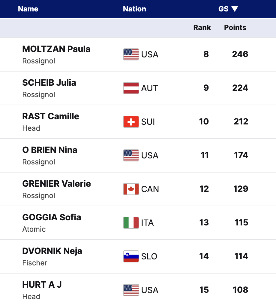 Paula Moltzan now sits 8th in the GS rankings, making her the top American. She is the only U.S. skier with a GS podium this season and recently claimed the World Championship bronze medal in Saalbach 2025. Nina O’Brien holds 11th place, continuing to be a strong presence in the discipline.