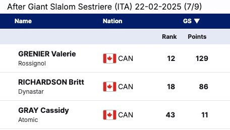 Cassidy Gray, ranked 43rd, has also contributed valuable points for Canada this season. With Grenier leading the way and Richardson rising, Canada’s GS squad remains a growing force on the circuit.