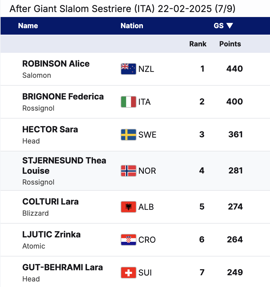Robinson leads the GS standings with a 40-point cushion over Brignone. Hector sits 79 points back, making her a contender. However, the gap widens significantly after the top three, with Stjernesund and Colturi trailing by over 150 points.
