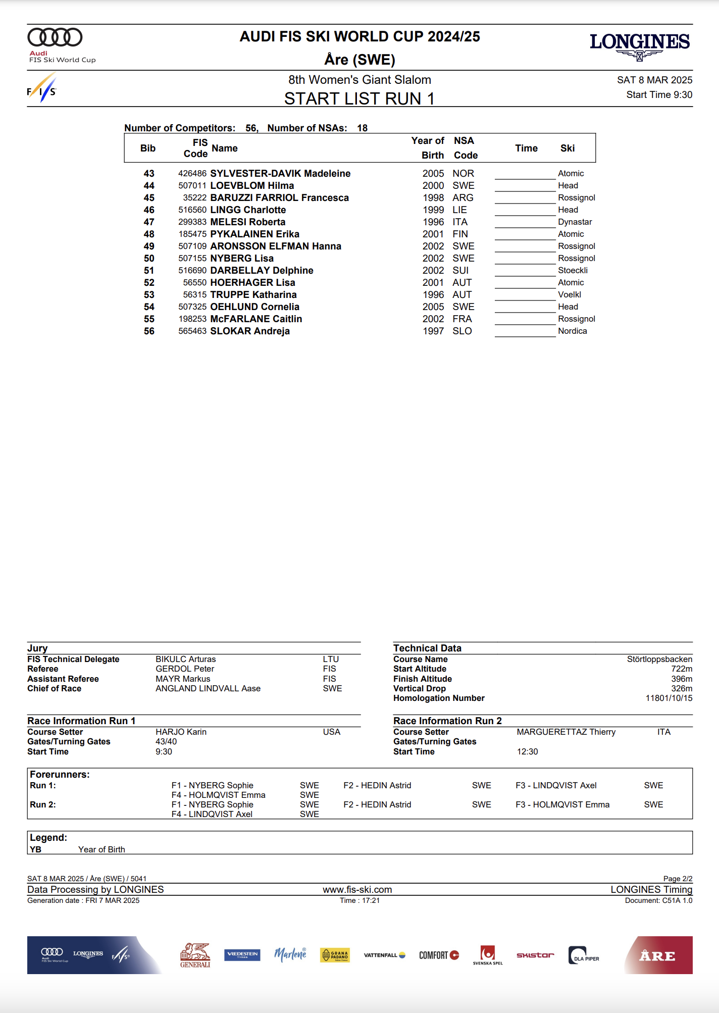 Fifty-six women representing 18 countries are set to compete in the World Cup Giant Slalom in Åre, Sweden, on March 8.