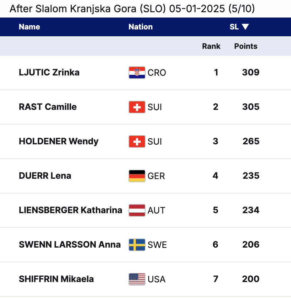 Croatia’s Zrinka Ljutić leads the slalom standings with 309 points, followed by Switzerland’s Camille Rast (305) and Wendy Holdener (265). With five races remaining, the battle for the season title remains unpredictable.
