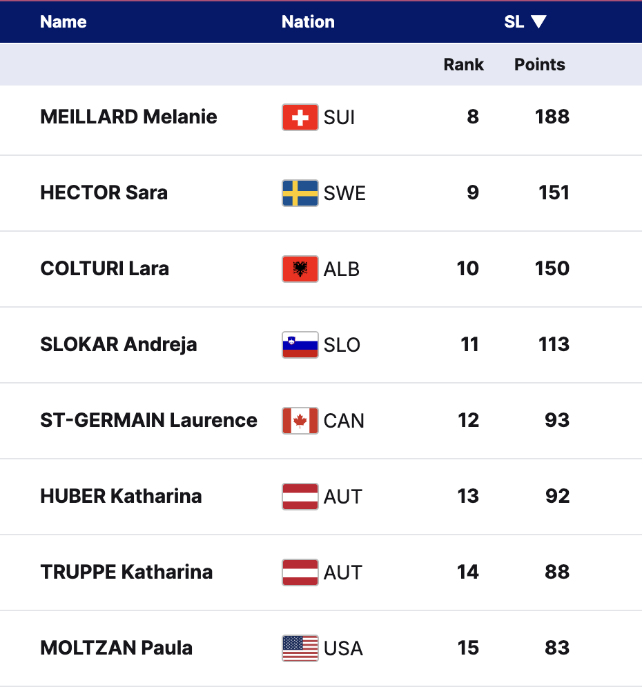 Katie Hensien delivered the best slalom result of her career in Kranjska Gora, finishing 12th. Ranked 29th overall, Hensien will aim to carry that momentum into Flachau as she continues to push for even stronger results in the second half of the season.