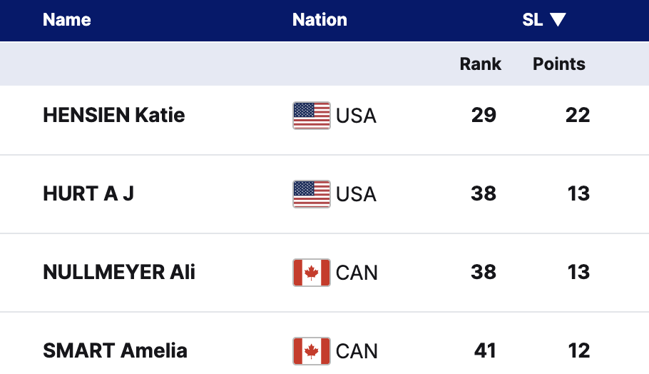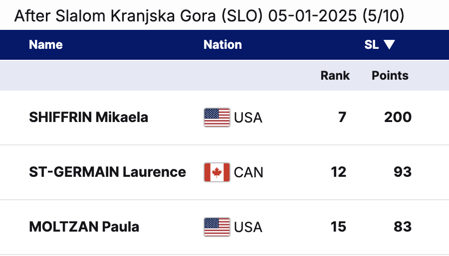 Laurence St-Germain, the reigning slalom world champion, is the highest-ranked North American in slalom, currently sitting 12th in the standings. St-Germain has yet to replicate her World Championship-winning form this season but is capable of breaking through at any moment.