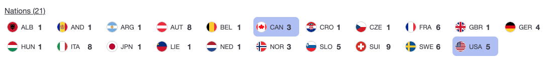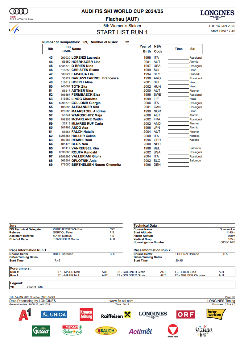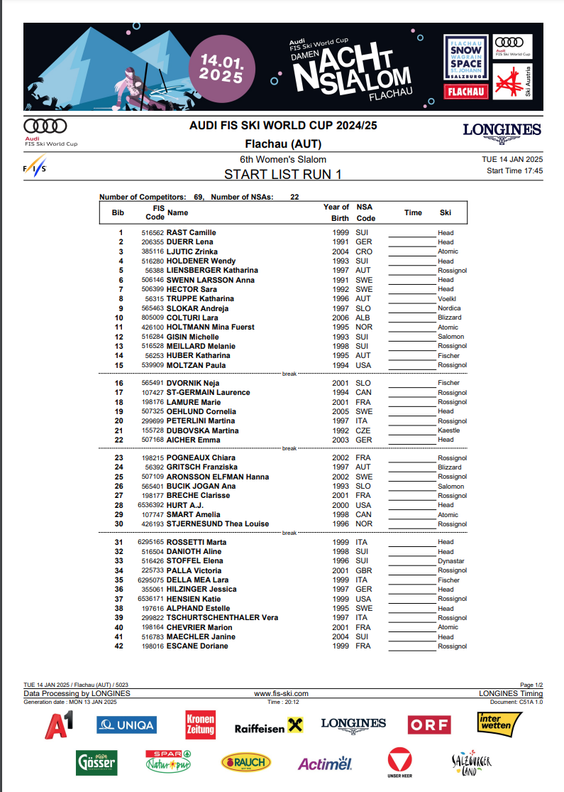Sixty-eight women from 21 nations will start the women’s World Cup SL in Flachau, Austria. Switzerland and Austria entered the most athletes, Switzerland fielding nine competitors and Austria starting with eight.