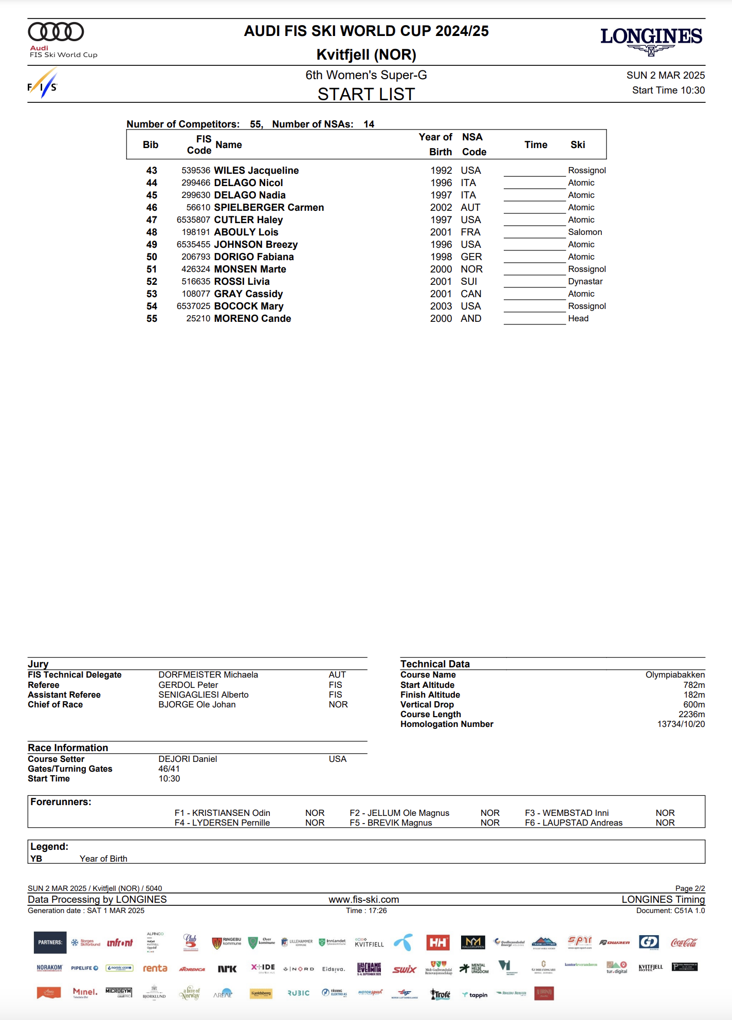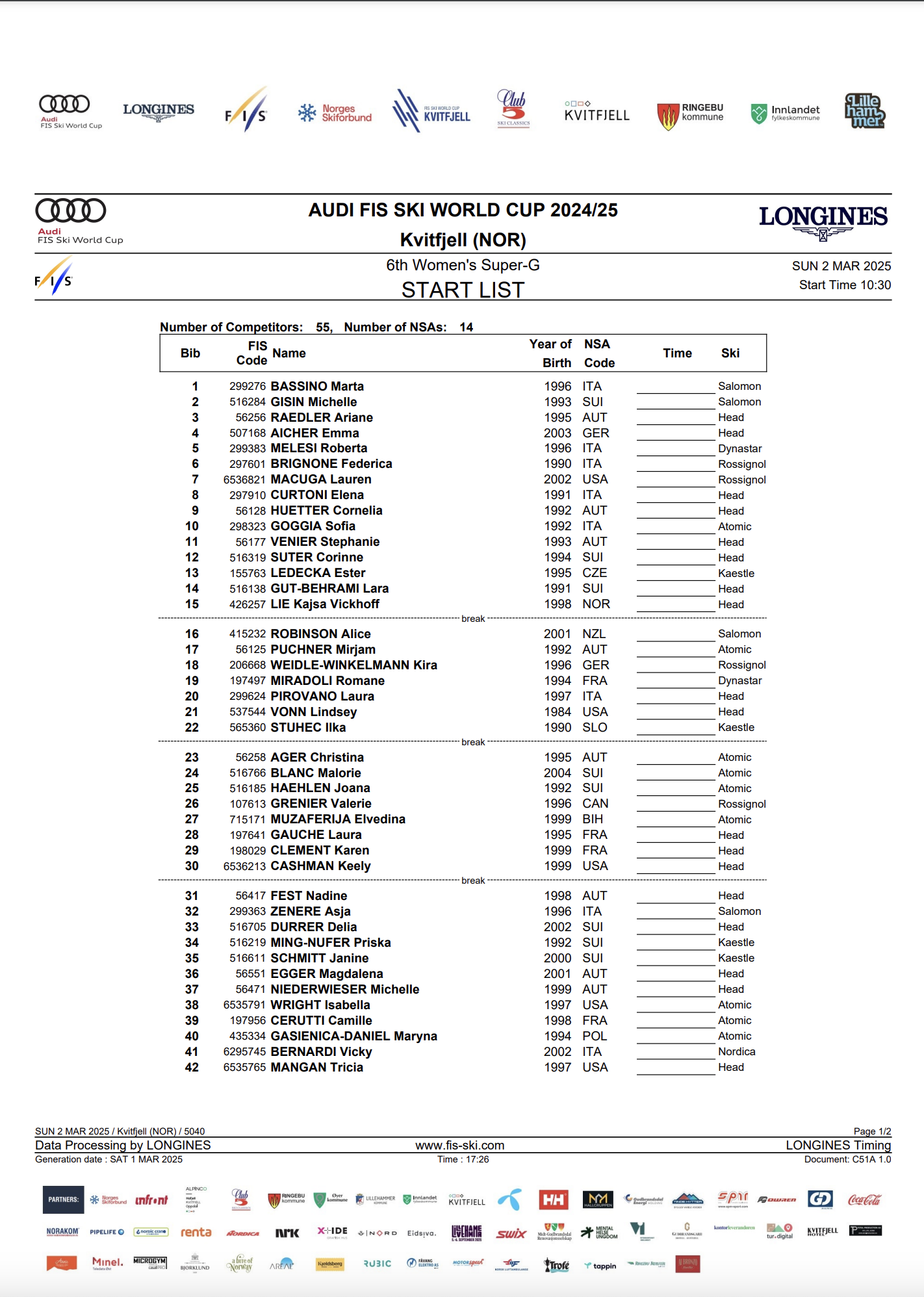 Fifty-five women from 14 countries are listed to compete in the Mar. 2 Kvitfjell, Norway Women’s Super-G.