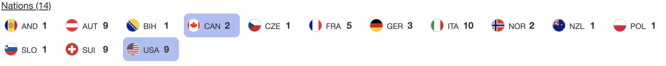 This distribution highlights Italy’s depth in super-G, with the most skiers in contention. Austria also shows strong representation with multiple contenders. Switzerland, the U.S., Norway, and the Czech Republic have fewer athletes ranked but remain competitive, with Switzerland leading the standings.