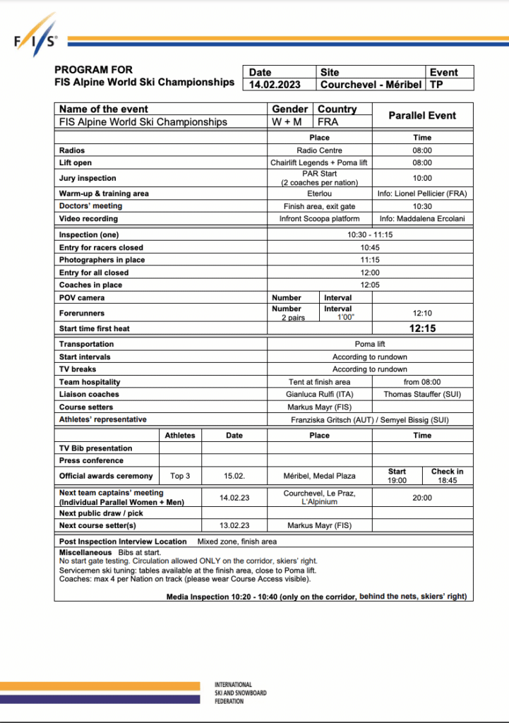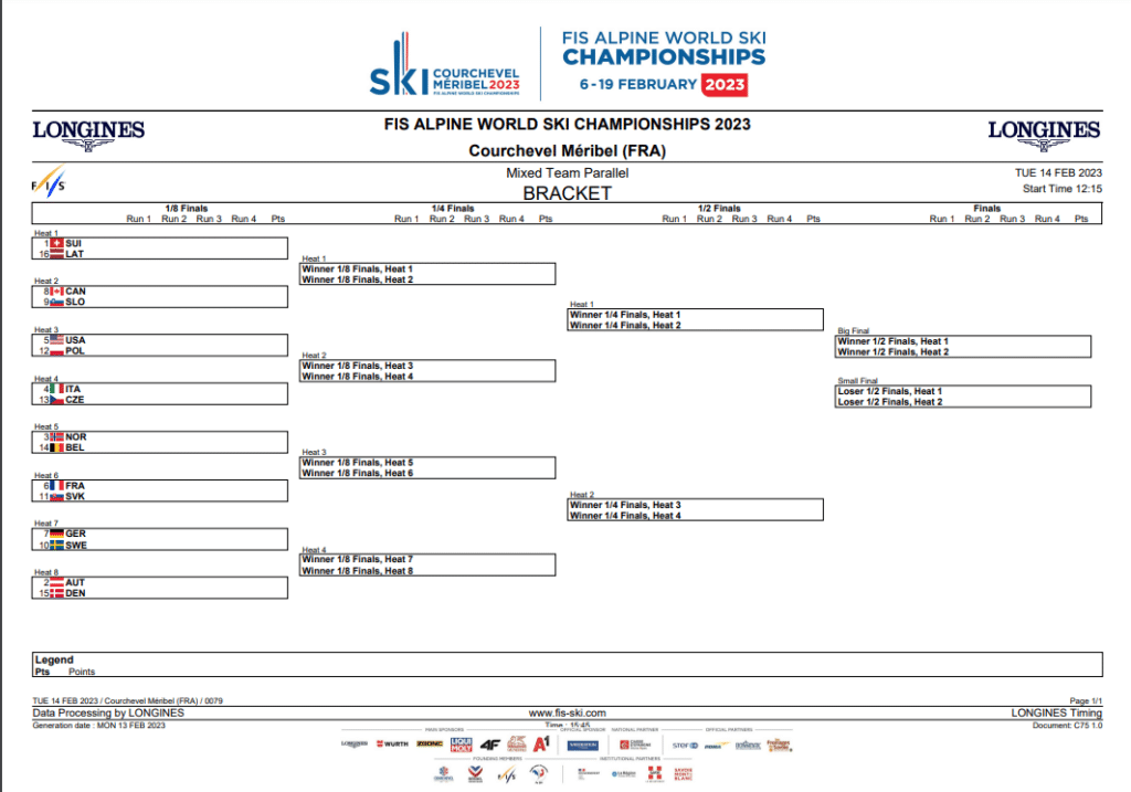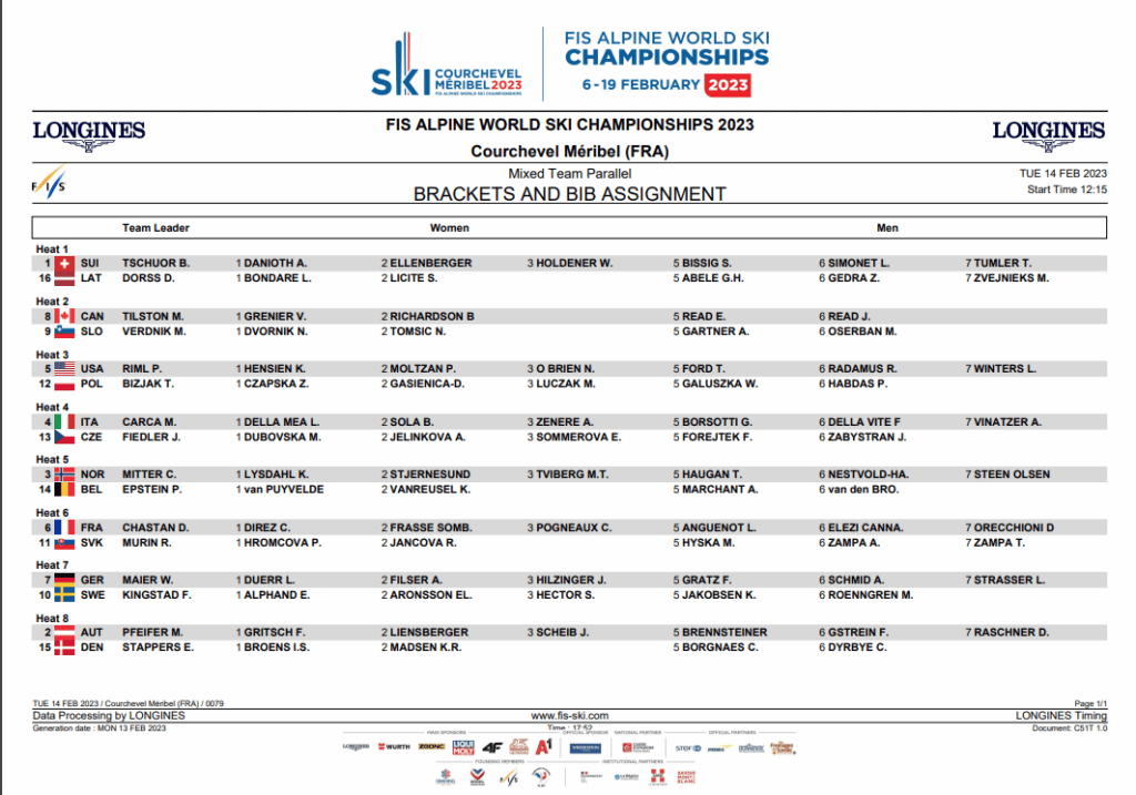 Tuesday, February 14th, the FIS Alpine World Ski Championships will feature the mixed team parallel in Meribel, France. During each round, two nations will compete in a dual format by racing two pairs of women and two pairs of men. If the score is tied after the four pairings (2-2), the combined times of the fastest male and female from each team will be used to decide which team advances. Notably, you can change the makeup of the team after each round.
