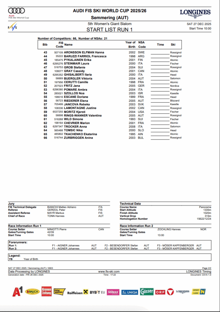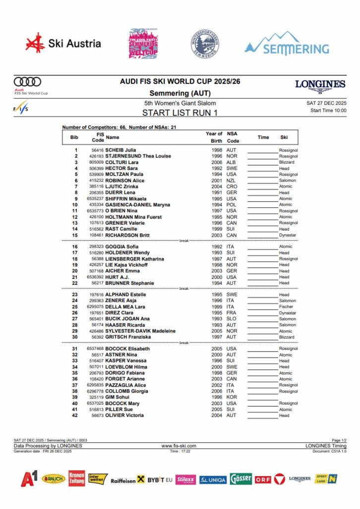 Semmering provides the next decisive checkpoint in a rapidly compressing Olympic GS season. With Robinson and Scheib continuing to define the standard, the room for error is slim — and every turn now shapes the road to Cortina.