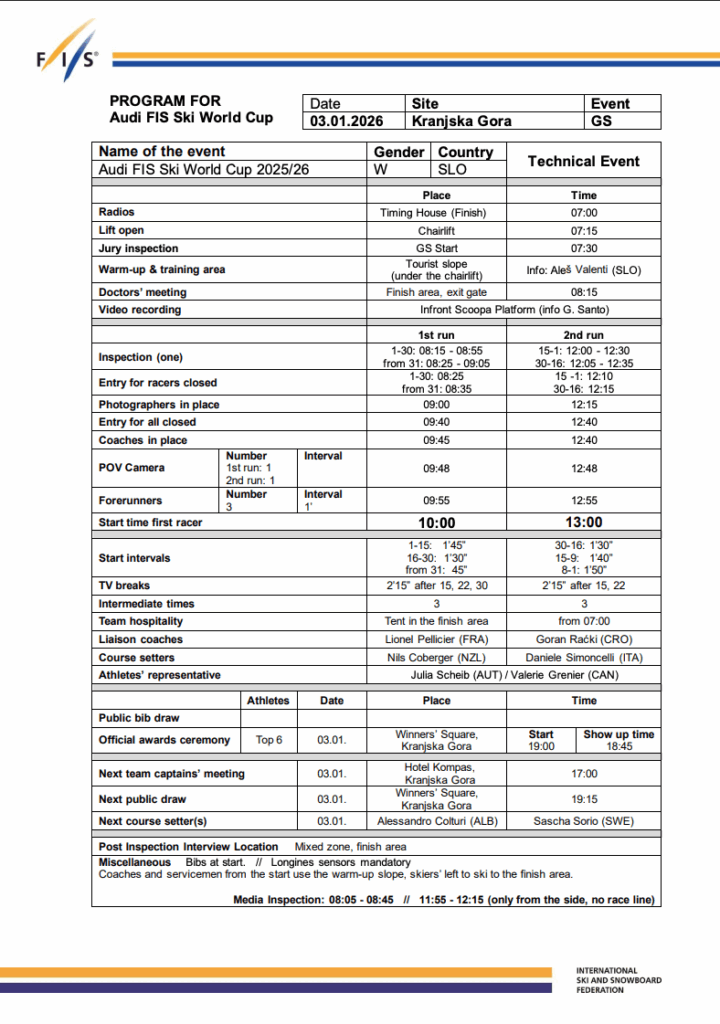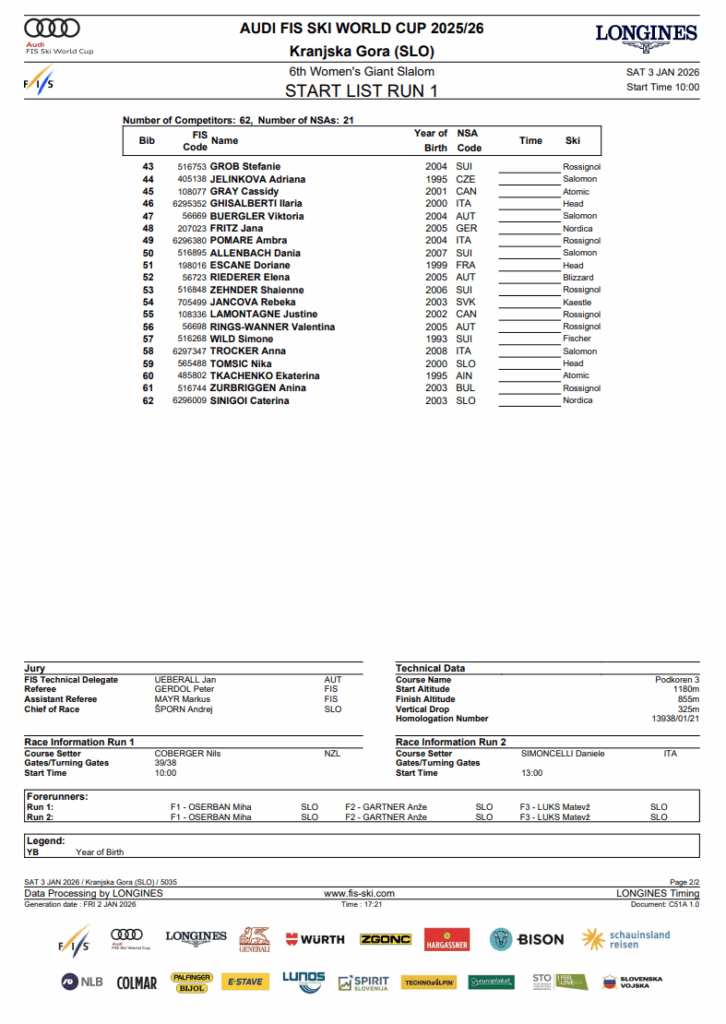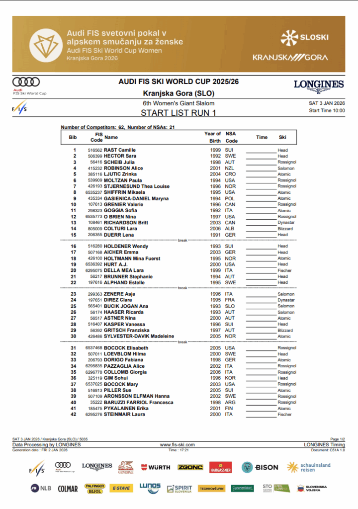The women’s World Cup giant slalom heads to Kranjska Gora, Slovenia, as the Olympic season enters a decisive phase. The January 3rd, Saturday’s race is the sixth GS of the 2025–26 campaign, and while opportunities remain on the calendar, the margin to perform is shrinking quickly across the entire field.