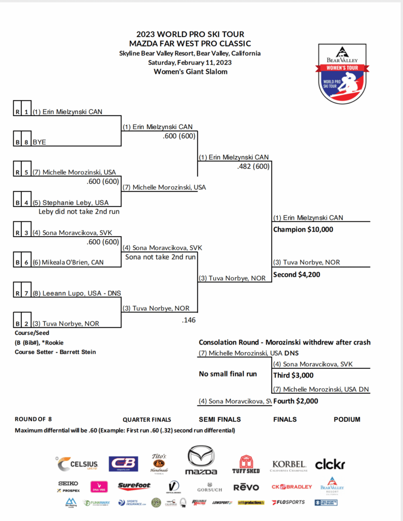 Old injuries plagued the women’s field with a round of eight reduced just to six with one bye and two DNS athletes. Even with a bye, Erin Mielzynski decided to ski her first heat so that she would be warm once it was time to face competitors. Sonia Moravcikova defeated O’Brien, while Norbye (who also skied the first run of her heats unopposed) moved on due to her opponent’s DNS.
