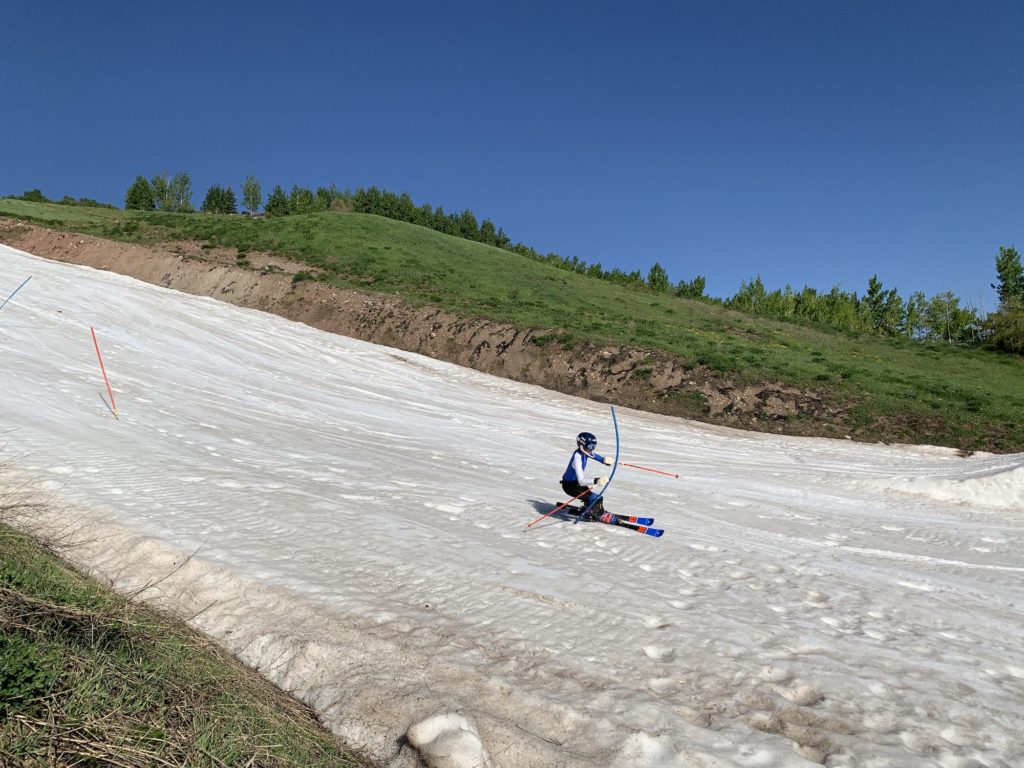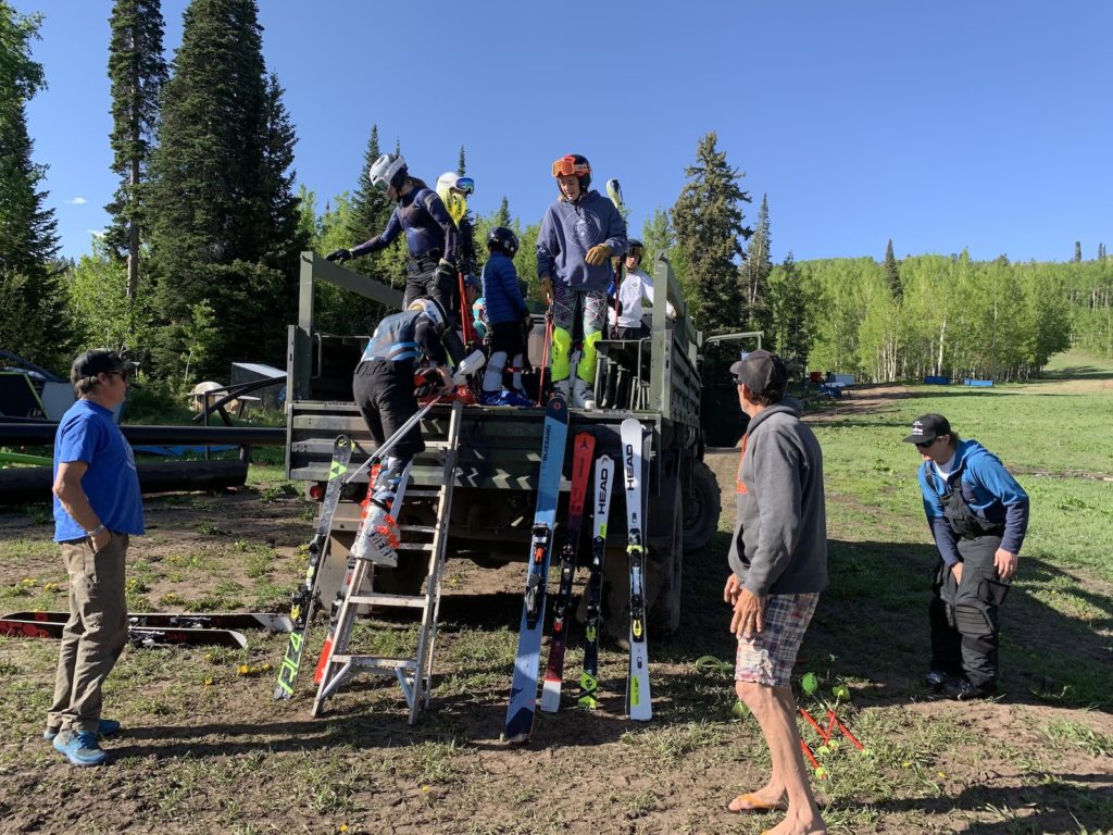 Just after 7 a.m. on the first Saturday of June, AVSC’s alpine program director Johno McBride shuttled 11 kids and three coaches up the front face of Buttermilk. Upon arrival at the top, the group was greeted with stubbies and three practice courses set and waiting for them on the training slope.