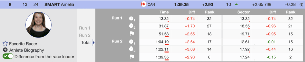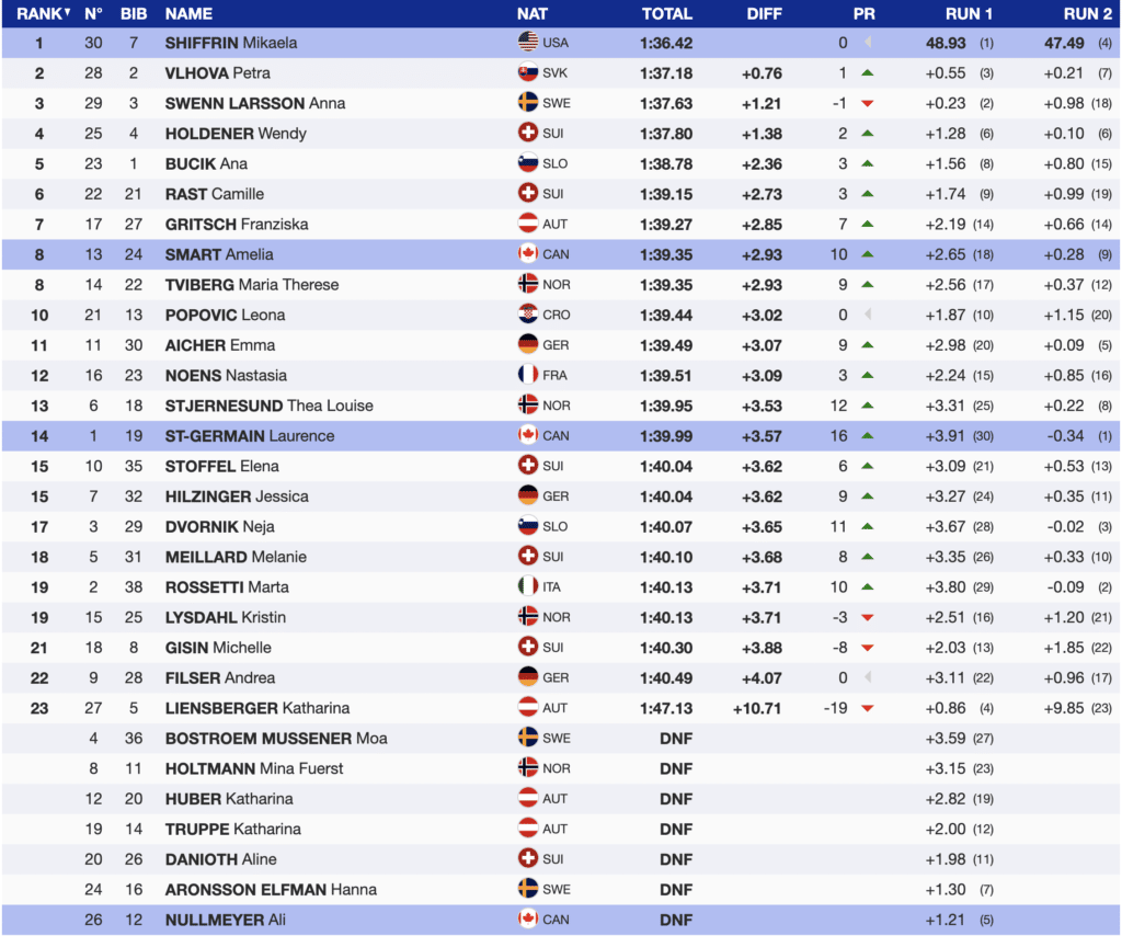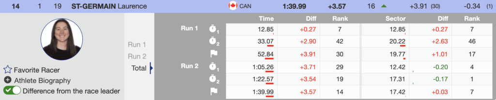 Canadian Laurence St Germain provided more great news for North American skiers and fans. Skiing a course first is advantageous but taking advantage of the opportunity is a skill. On a day like today, finishing 30th during the first run is advantageous. St. Germain took advantage of running first to move up 16 positions. Skiing the fastest final run, she finished 14th.