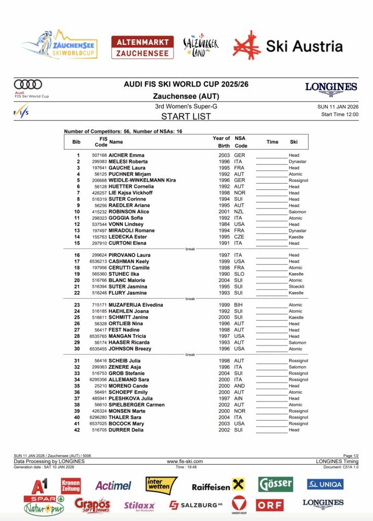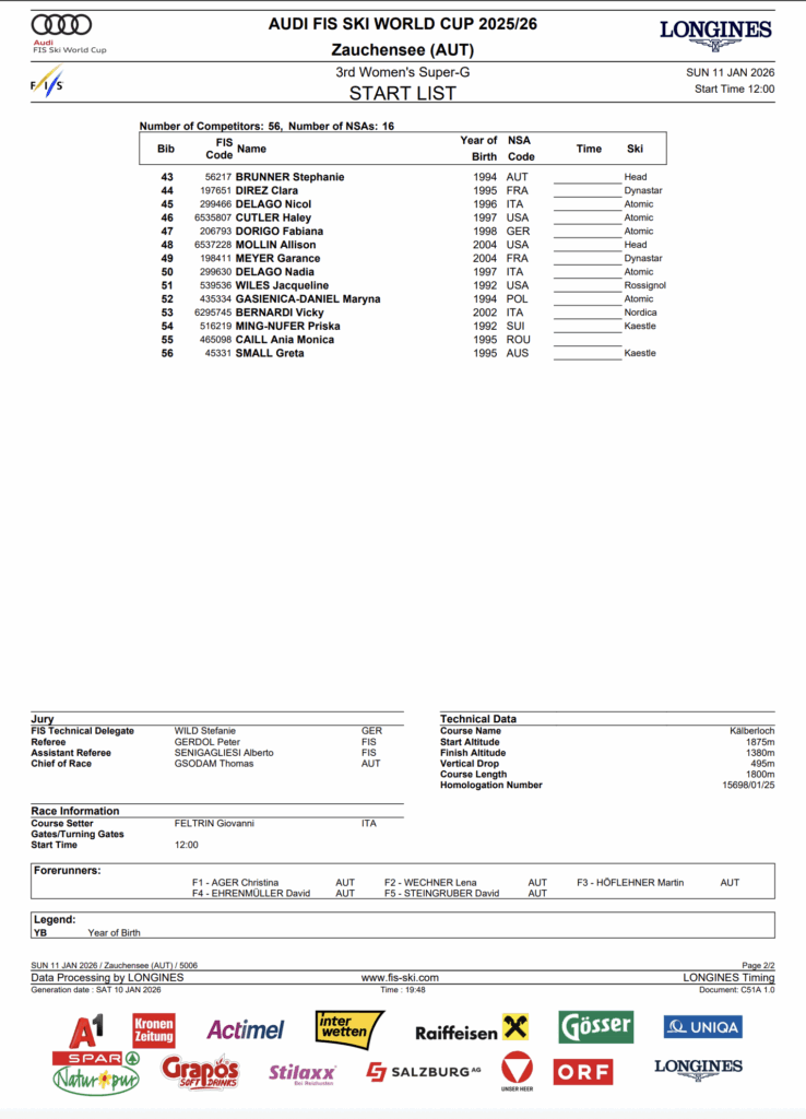 Zauchensee’s Kälberloch course demands aggression, clean direction changes, and the ability to carry speed through terrain that punishes indecision. With Olympic selection pressure rising and the elite field compressed, Sunday’s super-G offers a clear chance for athletes willing to attack — and a reminder that in speed racing, hesitation costs everything.